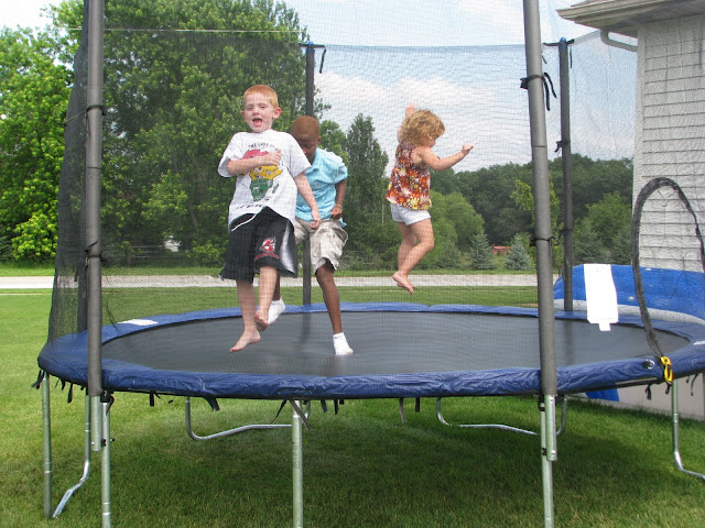 And of course, as is the way things seem to be going for us lately, as soon as I wrote this post last night it started storming and blowing…..aka 70mph winds……and in a swoop and a swoosh the trampoline was gone. Or so we thought. We found it across the street in some trees. We had even anchored it down, but apparently not enough! Thankfully we have one tough Daddy and two strong Africans who were on the recovery crew this morning. :)