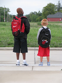 And then at 8:30am a text from our friend Chris who drove his daughter to school today and happened to be there when JJ got off the bus (which made me feel better since JJ has to switch buses halfway in between - I had confirmation that he made it to the right bus that takes him to his elementary!): JJ did well! I helped out a little bit in the class and he was good to go!